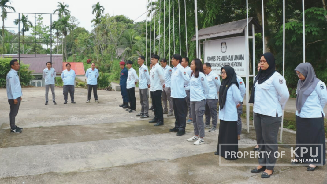 Tuapejat – Komisi Pemilihan Umum (KPU) Kabupaten Kepulauan Mentawai melaksanakan apel pagi rutin pada Senin (19/01) di halaman kantor KPU. Kegiatan ini diikuti oleh seluruh jajaran, mulai dari para Kasubbag hingga staf sekretariat. Bertindak sebagai pembina apel pagi adalah Rori Ade Putra, Sekretaris KPU Kabupaten Kepulauan Mentawai.