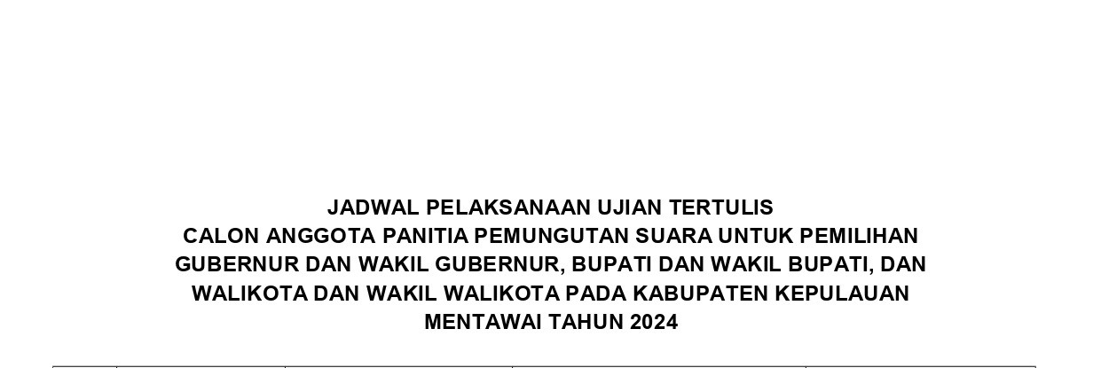 Jadwal Pelaksanaan Ujian Tertulis Calon Anggota Panitia Pemungutan Suara Untuk Pemilihan Gubernur dan Wakil Gubernur, Bupati dan Wakil Bupati, serta Walikota dan Wakil Walikota Pada Kabupaten Kepulauan Mentawai Tahun 2024. Untuk informasi lebih lanjut silahkan download Disini