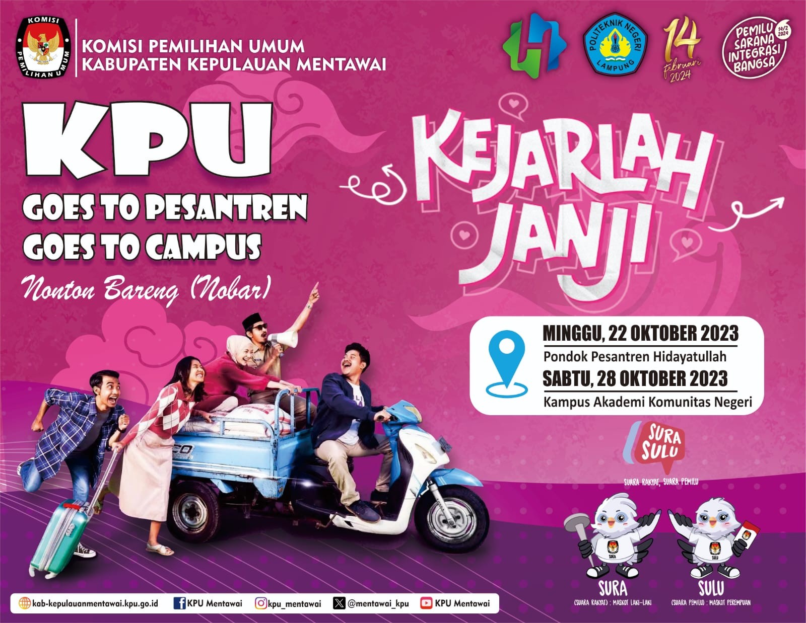 Kegiatan nobar film Kejarlah Janji yang bertepatan dengan peringatan Hari Santri Nasional ini, merupakan program KPU RI dalam sosialisasi Pemilu Serentak 2024 kepada para santri.