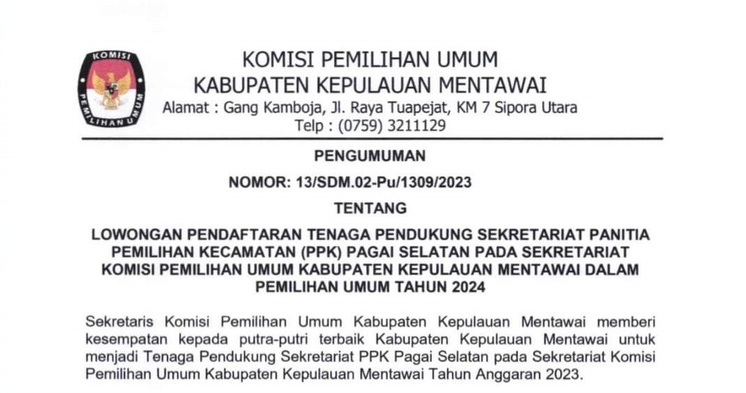 Pengumuman Nomor: 13/SDM.02-Pu/1309/2023 Tentang Pendaftaran Tenaga Pendukung Sekretariat Panitia Pemilihan Kecamatan (PPK) Pagai Selatan pada Sekretariat Komisi Pemilihan Umum Kabupaten Kepulauan Mentawai Dalam Pemilihan Umum Tahun 2024. untuk informasi lebih lanjut serta dokumen pendukung dapat di Download dibawah ini :