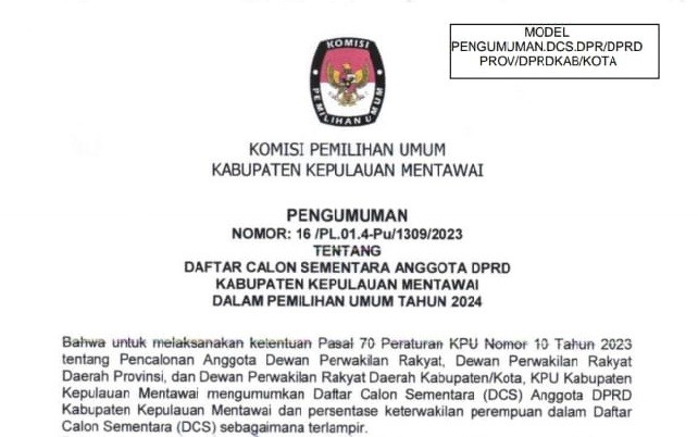Pengumuman Nomor : 16 /PL.01.4-Pu/1309/2023 Tentang Daftar Calon Sementara (DCS) Anggota DPRD Kabuapten Kepulauan Mentawai Dalam Pemilihan Umum Tahun 2024, Untuk Info Lengkap Dapat Download DI SINI