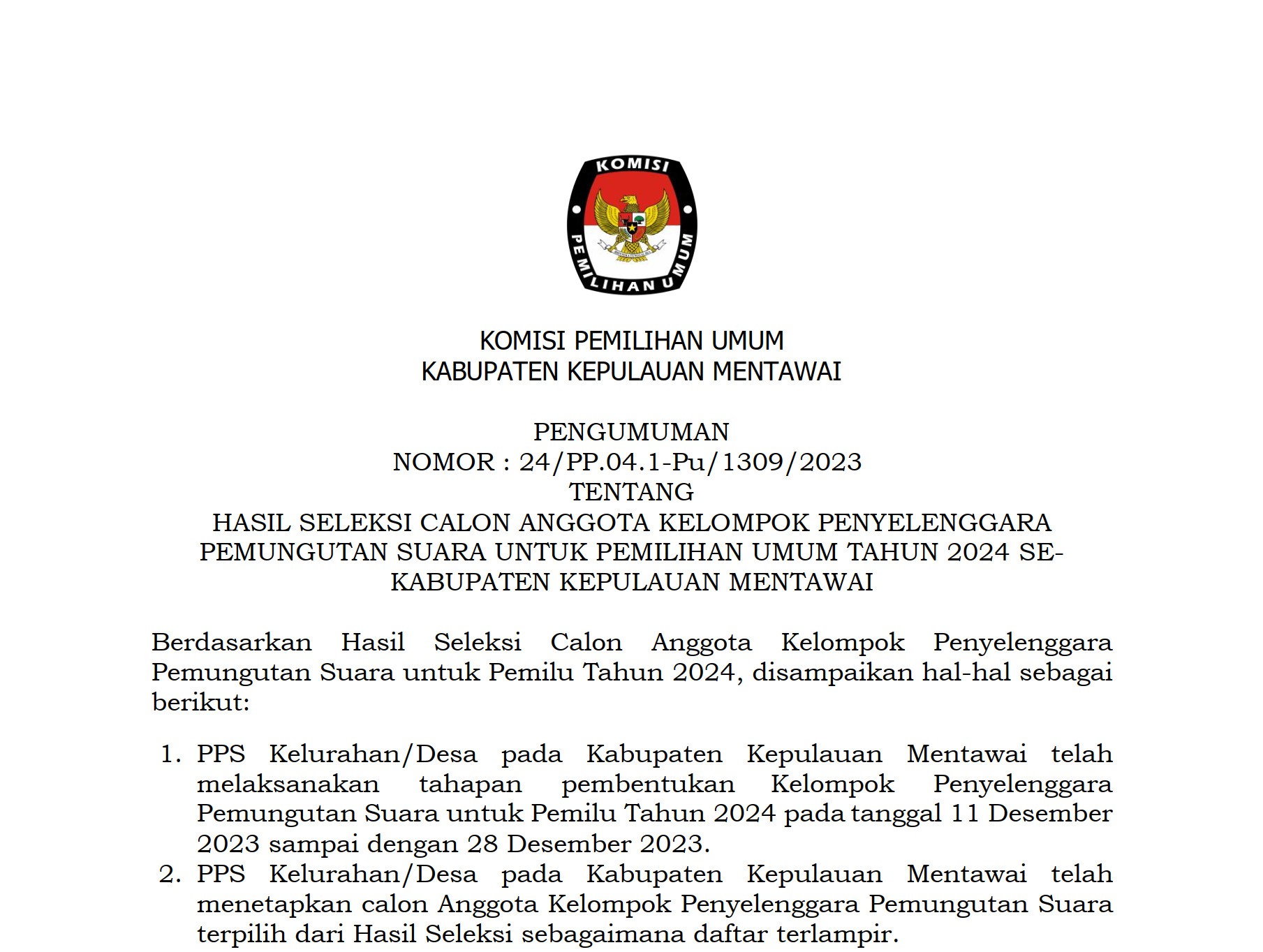 Pengumuman Komisi Pemilihan Umum Kabupaten Kepulauan Mentawai Nomor : 24/PP.04.1-Pu/1309/2023 Tentang Hasil Seleksi Calon Anggota Kelompok Penyelenggara Pemungutan Suara Untuk Pemilihan Umum Tahun 2024 Se-Kabupaten Kepulauan Mentawai. Untuk lebih lengkap download disini