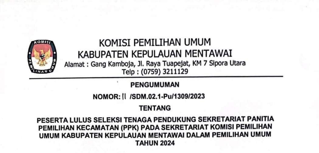 Berikut kami sampaikan pengumuman peserta lulus seleksi tenaga pendukung sekretariat Panitia Pemilihan Kecamatan (PPK) di Komisi Pemilihan Umum Kabupaten Kepulauan Mentawai, silahkan ketik link di bawah ini untuk info lebih lanjut:
