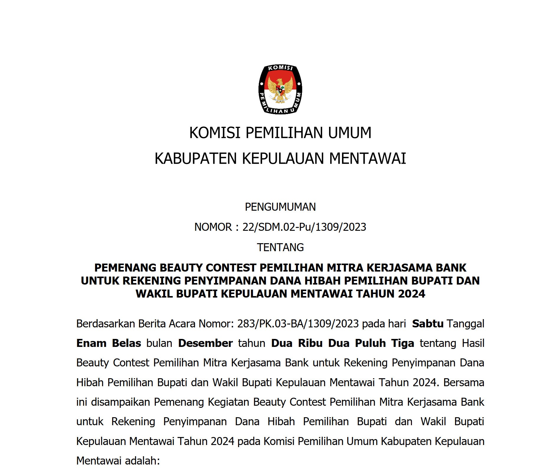 Pengumuman Komisi Pemilihan Umum Kabupaten Kepulauan Mentawai Nomor : 22/SDM.02-Pu/1309/2023 Tentang Pemenang Beauty Contest Pemilihan Mitra Kerjasama Bank untuk Rekening Penyimpanan Dana Hibah Pemilihan Bupati dan Wakil Bupati Kepulauan Mentawai Tahun 2024. Untuk lebih lengkap download disini