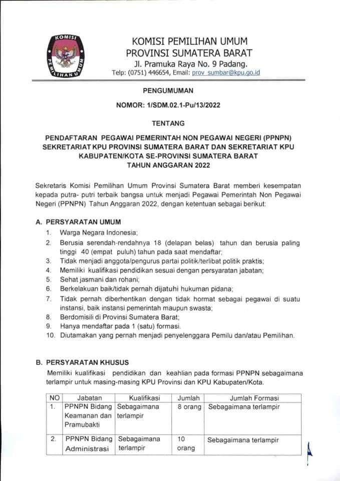 PENGUMUMAN NOMOR: 1/SDM.02.1-Pu/13/2022 TENTANG PENDAFTARAN PEGAWAI PEMERINTAH NON PEGAWAI NEGERI (PPNPN) SEKRETARIAT KPU PROVINSI SUMATERA BARAT DAN SEKRETARIAT KPU KABUPATEN/KOTA SE-PROVINSI SUMATERA BARAT TAHUN ANGGARAN 2022.