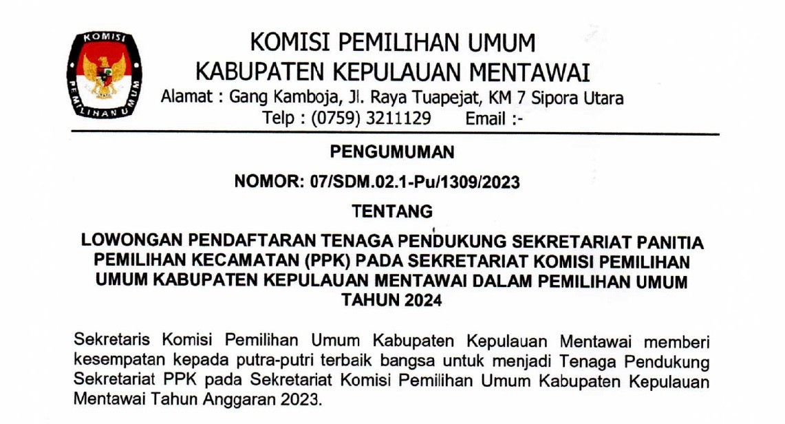 PENGUMUMAN NOMOR: 07/SDM.02.1-Pu/1309/2023 TENTANG LOWONGAN PENDAFTARAN TENAGA PENDUKUNG SEKRETARIAT PANITIA PEMILIHAN KECAMATAN (PPK) PADA SEKRETARIAT KOMISI PEMILIHAN UMUM KABUPATEN KEPULAUAN MENTAWAI DALAM PEMILIHAN UMUM TAHUN 2024. UNTUK PERSYARATAN DAN FORMULIR SILAHKAN KLIK LINK DI BAWAH INI :