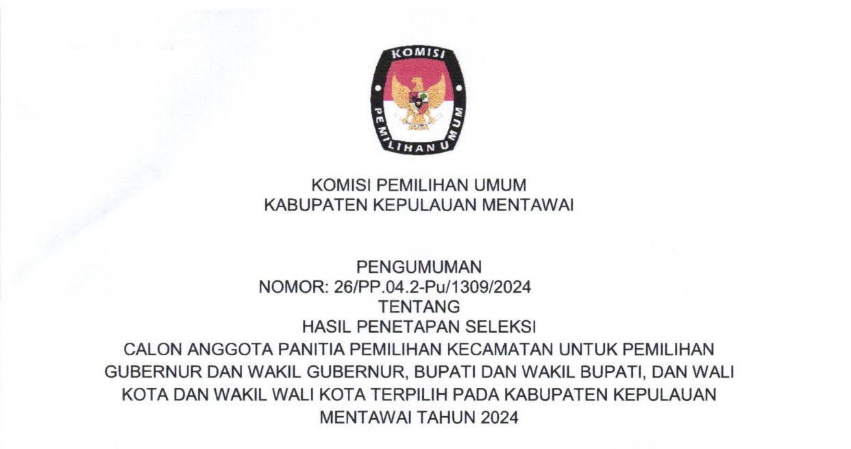 Pengumuman Nomor: 26/PP.04.2-Pu/1309/2024 tentang Hasil Penetapan Seleksi Calon Anggota Panitia Pemilihan Kecamatan Untuk Pemilihan Gubernur dan Wakil Gubernur, Bupati dan Wakil Bupati serta Walikota dan Wakil Walikota Terpilih pada Kabupaten Kepulauan Mentawai Tahun 2024. untuk info lebih lanjut bisa baca Disini