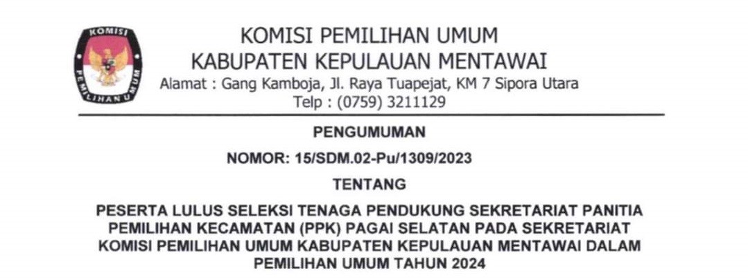 Pengumuman Nomor : 15 /SDM.02-Pu/1309/2023 tentang Peserta lulus seleksi tenaga pendukung sekretariat Panitia Pemilihan Kecamatan (PPK) Pagai Selatan pada sekretariat Komisi Pemilihan Umum Kabupaten Kepulauan Mentawai dalam Pemilihan Umum Tahun 2024, untuk informasi lebih lanjut silahkan download DI SINI