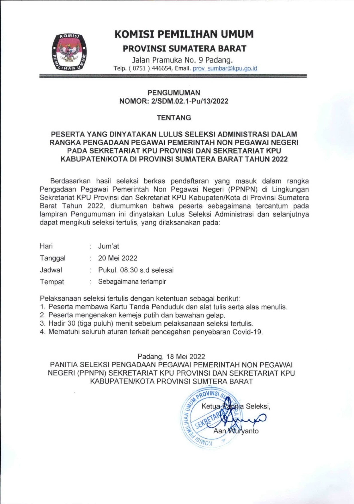 PENGUMUNAN SELEKSI ADMINISTRASI PENERIMAAN PEGAWAI PEMERINTAH NON PEGAWAI NEGERI DI KPU SE-PROVINSI SUMBAR TAHUN 2022 Rabu, 18 Mei 2022 00:00 664 PENGUMUMAN NO. 2/SDM.02.1-Pu/13/2022 TENTANG PESERTA YANG DINYATAKAN LULUS SELEKSI ADMINISTRASI DALAM RANGKA PENGADAAN PEGAWAI PEMERINTAH NO PEGAWAI NEGERI PADA SEKRETARIAT KPU PROVINSI DAN SEKRETARIAT KPU KABUPATEN/KOTA DI PROVINSI SUMATERA BARAT TAHUN 2022 Bagikan: Dilihat 664 Kali.