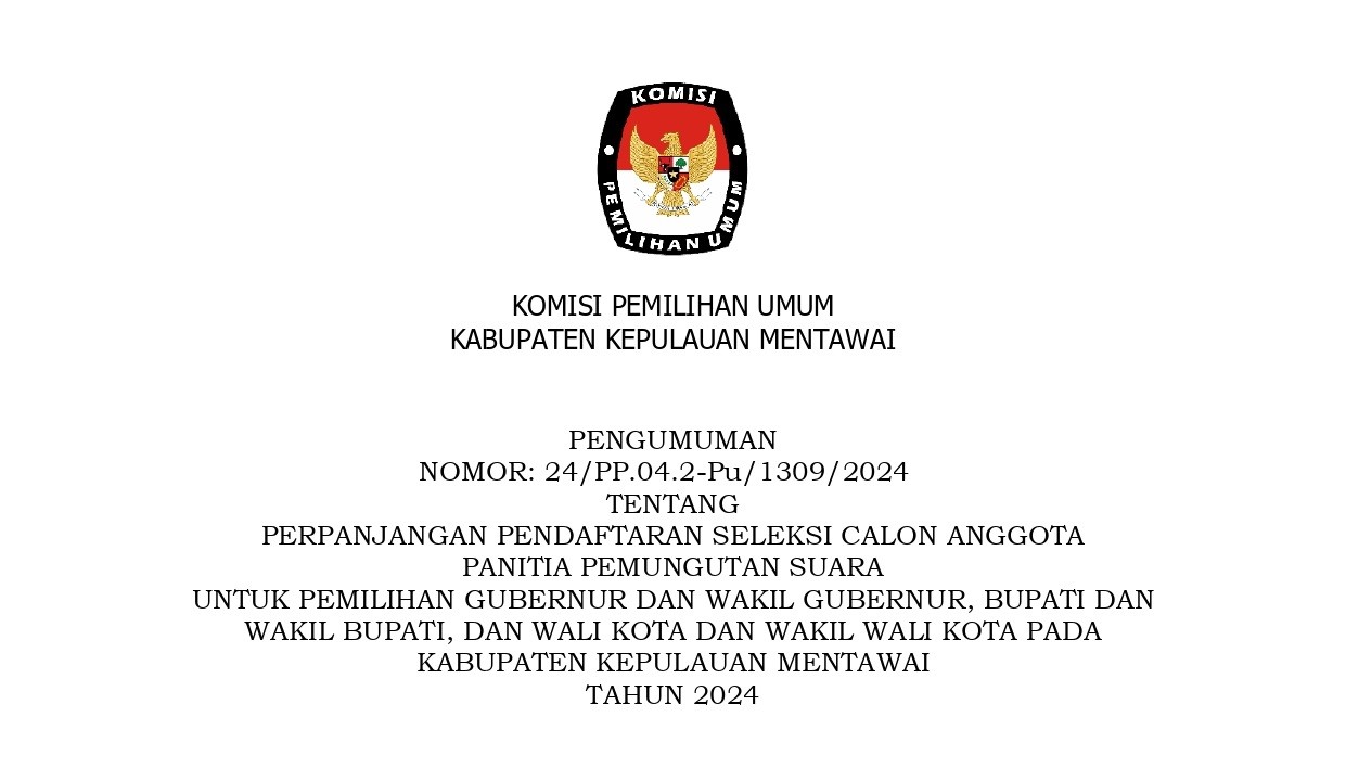 Pengumuman Nomor: 24/PP.04.2-Pu/1309/2024 tentang Perpanjangan Pendaftaran Seleksi Calon Anggota Panitia Pemungutan Suara (PPS) untuk Pemilihan Gubernur dan Wakil Gubernur, Bupati dan Wakil Bupati, serta Walikota dan Wakil Walikota pada Kabupaten Kepulauan Mentawai Tahun 2024, untuk informasi lebih lengkap lihat Disini