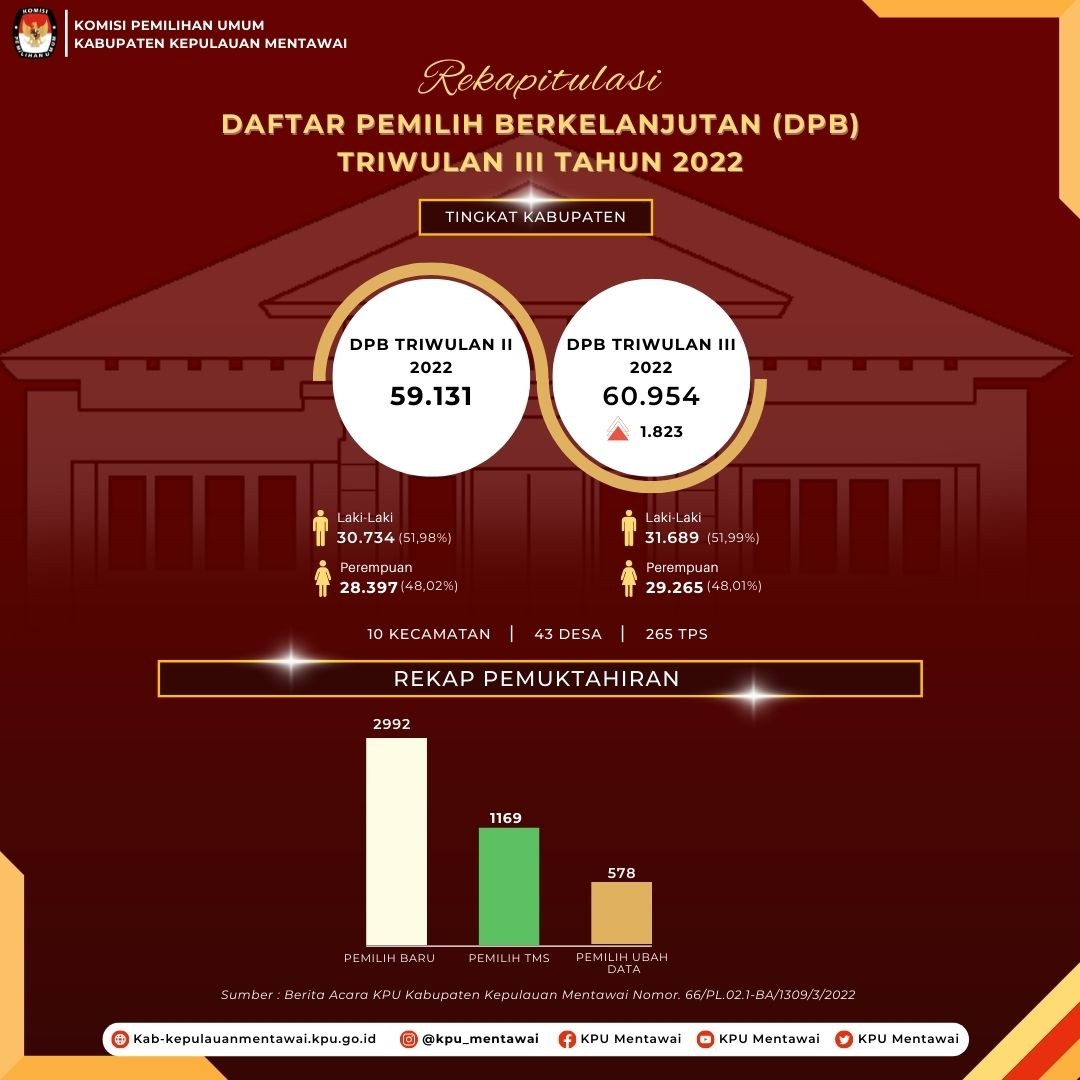 REKAPITULASI DAFTAR PEMILIH BERKELANJUTAN (DPB) TRIWULAN III TAHUN 2022 Sabtu, 01 Oktober 2022 13:24 669 BERITA ACARA NOMOR : 66/PL.02.1-BA/1309/3/2022 TENTANG DAFTAR PEMILIH BERKELANJUTAN PERIODE TRIWULAN III TAHUN 2022 Bagikan: Dilihat 669 Kali.